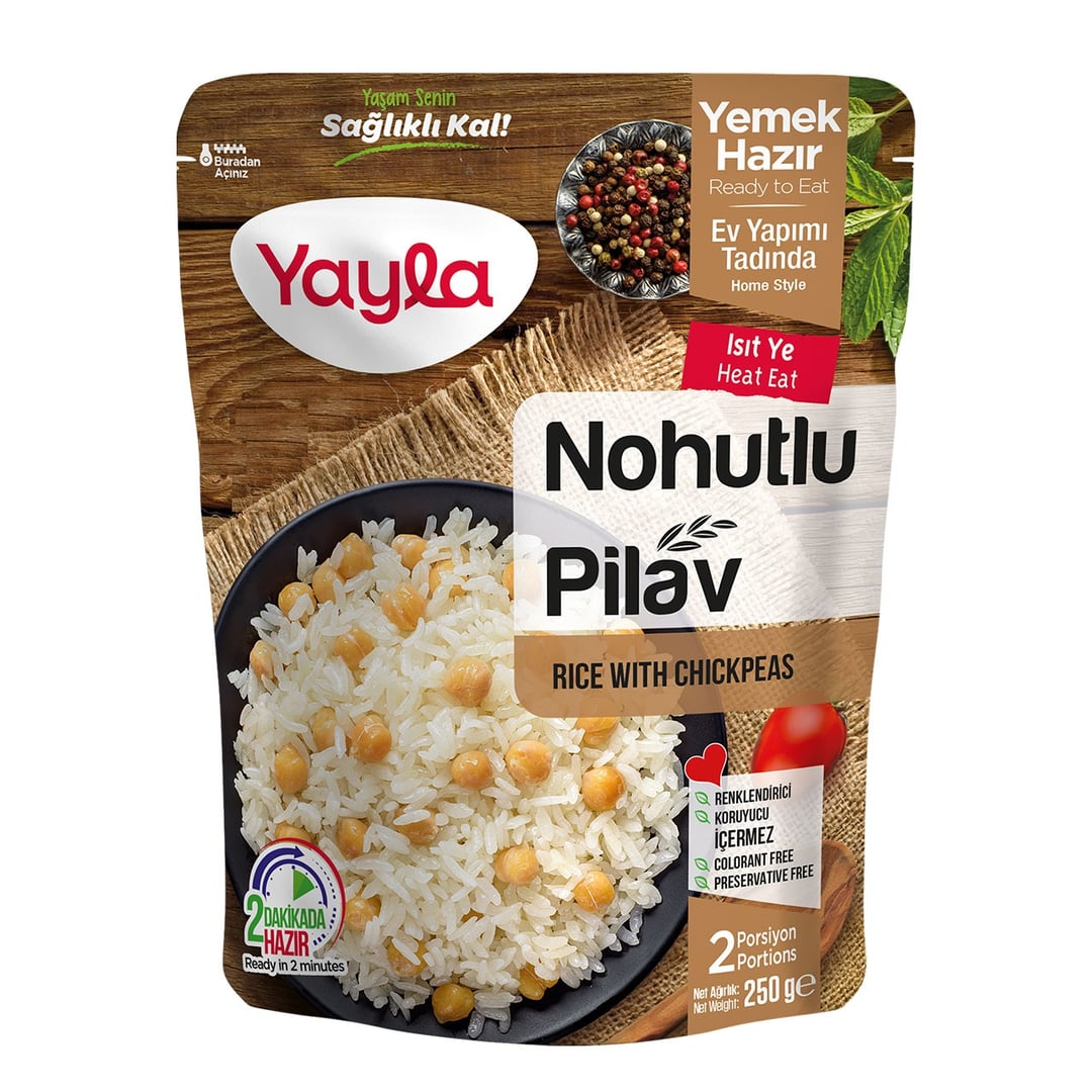 Yayla Hazır Nohutlu Pirinç Pilavı, mutfağımızda da yaygın olarak tüketilen ve sevilen bir pirinç pilavı türü olan nohutlu pilavın hazır halidir. Zengin lif kaynağı olduğundan ve lezzeti nedeniyle nohut, pirinç pilavlarında yaygın olarak kullanılır. Özellikle son yıllarda nohutlu pilav, zengin içeriği ve lezzeti nedeniyle en çok tüketilen sokak lezzetlerinden bir tanesi olarak karşımıza çıkmaktadır.