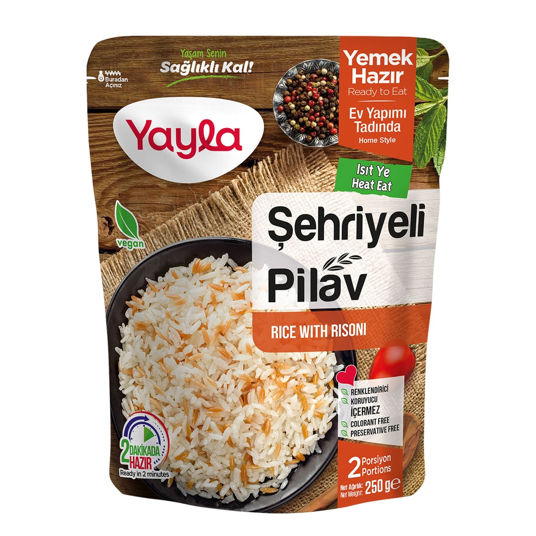 Şeklinde sıralanır. Pirinç pilavı hazırlayacak süreniz yoksa paket içeriğini ısıtabileceğiniz bir kaba boşaltarak, ocakta veya mikrodalga fırında ısıtarak yemek için hazır pilav elde edebilirsiniz. Şimdi, Yayla’nın sizlere sunduğu hazır pirinç pilavı çeşitlerinin tarif ve özelliklerinden söz edelim.