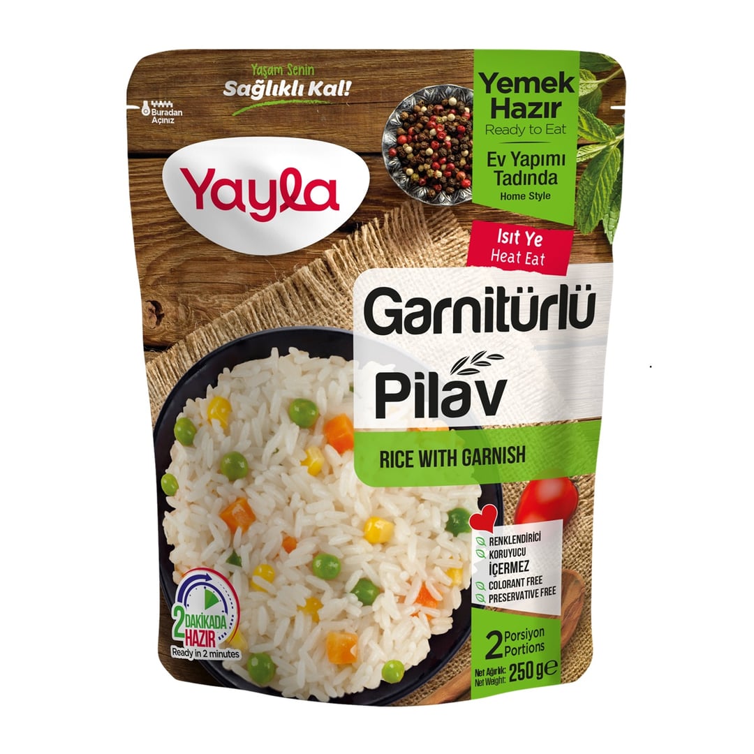 Yayla Hazır Garnitürlü Pirinç Pilavı, içinde havuç, bezelye ve mısır gibi besleyici değeri yüksek, lif açısından zengin çeşitli sebzelerin de bulunduğu bir pilavdır. Taneli sebzelerden özellikle mısır, cilde faydası yüksek bir sebze iken, havuç A Vitamini açısından zengindir. Bununla birlikte bezelye, pirinç pilavı ile neredeyse ayrı anılmayan taneli sebzelerden bir tanesidir.